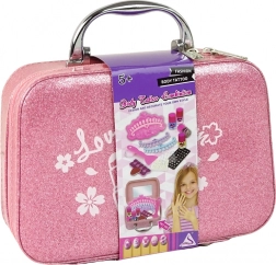Fedezd fel a varázslatos készletet a kis stylistoknak – kompakt, rózsaszín, csillogó bőrönd tele körömdíszítő kiegészítőkkel. Az egyszerű cipzárnak, az erős fogantyúnak és a belső tükörnek köszönhetően a gyerekek bárhol biztonságosan és kényelmesen készíthetik el első körömdíszítéseiket. A szett tartalmaz 4 színes lakkot, bélyegzőlemezt, matricákat és strasszokat, ujjelválasztókat és további eszközöket a kreatív körömdíszítéshez.