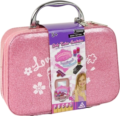 - Rózsaszín csillogó bőrönd tükörrel, 4 színes körömlakk, ujjválasztó, reszelő, bélyegző, mintás bélyegzőlemez, kaparó/spatula, 3 sablon tippekre, tipmatricák, öntapadós matricák és strasszok, kis tartó