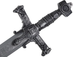 Ez a részletgazdagon kidolgozott műanyag kard autentikus középkori megjelenést nyújt éles élek nélkül, így kiváló választás biztonságos gyermek szórakozáshoz. A díszített markolat elegáns, történelmi hangulatot ad a kardnak, míg a csatahang-effektek felerősítik minden kaland atmoszféráját.