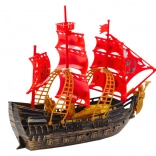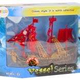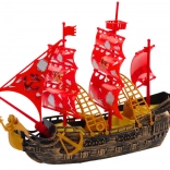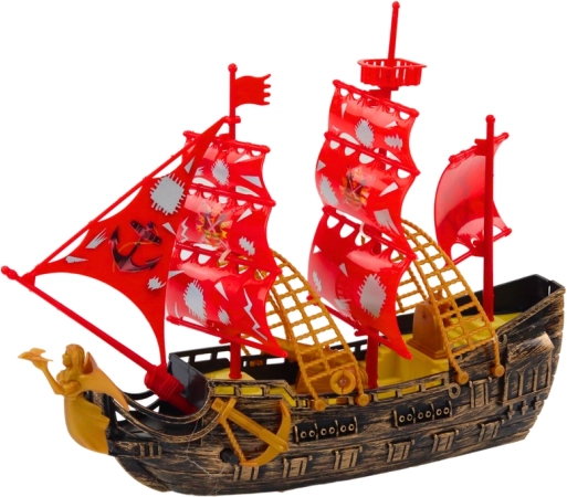 A hajó aranybarna oldala elegáns és autentikus megjelenést kölcsönöz, méltó a régi idők igazi kalózhajóihoz. A piros árbócokkal, melyeken kalóz jelképek lobognak, azonnal magára vonja a figyelmet és megteremti a titokzatos tengeri kalandok hangulatát. Ezeknek a részleteknek köszönhetően a játék úgy fest, mint egy valódi hajó, készen arra, hogy meghódítsa a tengereket és óceánokat.