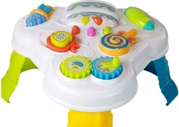Az asztalon nagyméretű fogaskerekek találhatók, amelyek forgatáskor mozognak, egy nyalóka, amely csörgőként működhet, és egy almácska, mint síp. Különböző formák és színek vonzzák a gyermek figyelmét, és segítenek a színek és textúrák felismerésében.
