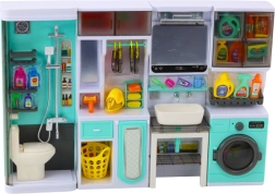 Zuhany WC-vel, tükörrel ellátott mosdó, szekrénnyel kombinált mosógép, valamint polcok vasalódeszkával egy komplett játékkészletet alkotnak a változatos háztartási szerepjátékhoz.