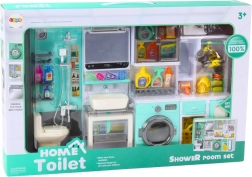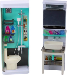 Ez az átgondolt szett 4 összekapcsolt egységből áll: zuhanykabin WC-vel, tükörrel ellátott mosdó, szekrénnyel kombinált mosógép, valamint polcok vasalódeszkával. A türkiz-fehér dizájn és a precíz kidolgozás ösztönzi a képzeletet, és motiválja a gyerekeket a mindennapi tevékenységek utánzására. A 35 × 26 × 8 cm-es méret ideális a gyerekszobába vagy a babaházhoz.