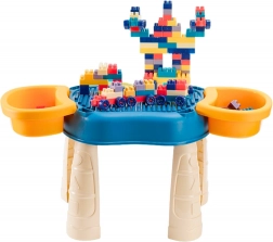 Az asztal játékszinttel rendelkezik, amelyen a gyerekek különféle szerkezeteket építhetnek színes kockákból.