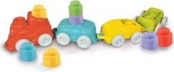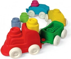 A puha, színes kockákat be lehet helyezni a mozdonynál és a vagonoknál lévő nyílásokba, vagy egymásra rakni, így puha, színes tornyokat alkotni.