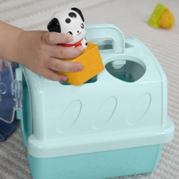 A készlet különféle kockákat tartalmaz – némelyik állatos, mások klasszikus formájúak – amelyek a szállító tetején lévő megfelelő kivágásokba illenek. A játék kb. 6 hónapos kortól ideális, és együtt nő a gyermekkel: a formák felfedezésétől az első válogatáson át a színek megnevezéséig.