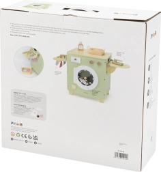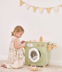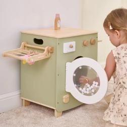 Ez a minőségi, fából készült mosógép finom pasztellzöld színben, természetes fa részletekkel hiteles élményt nyújt mosáshoz, szárításhoz és vasaláshoz. A kezelőgombok, az átlátszó ajtó és az oldalsó, összecsukható szárító csipeszekkel hosszú órákon át biztosítanak értelmes játékot és készségfejlesztést.