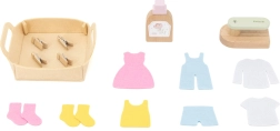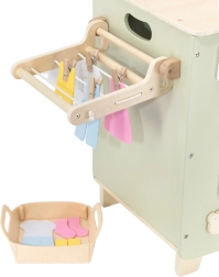 A szett tartalmaz továbbá kiegészítőket: mosószert, szennyeskosarat, filc ruhácskákat és fa vasalót. A masszív fa kialakításnak és a sima éleknek köszönhetően a játék biztonságos és strapabíró a mindennapos használathoz.