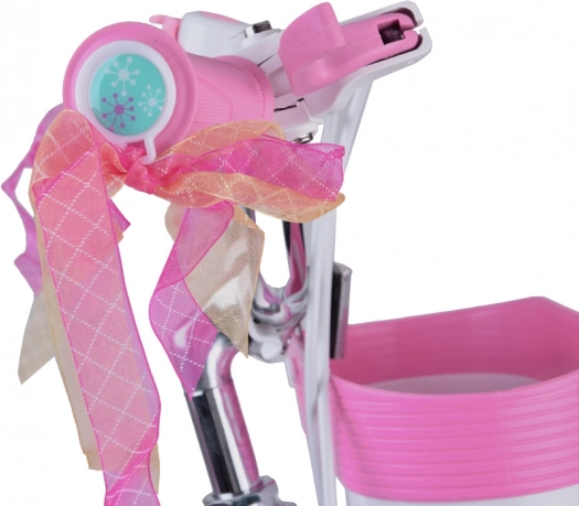 Ergonomikus kormány puha markolatokkal, csengővel és díszszalagokkal, kiegészítve elülső kosárral a kis kincseknek.