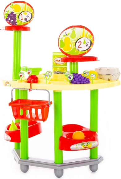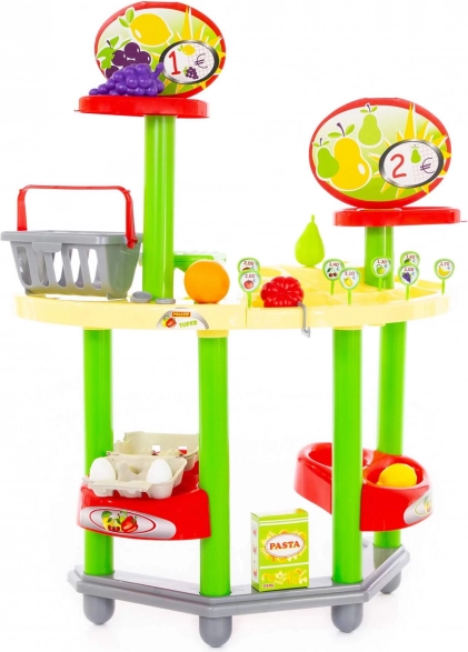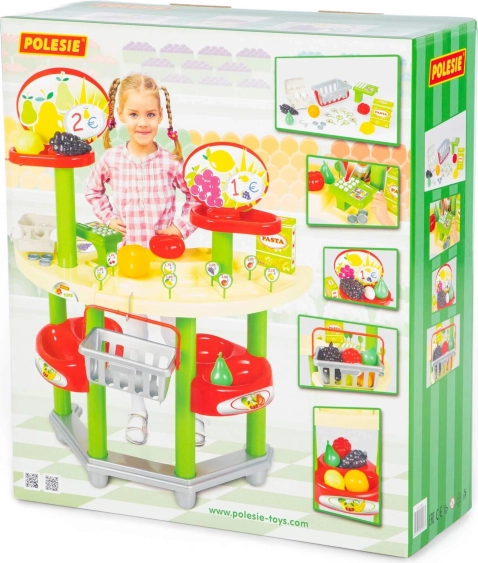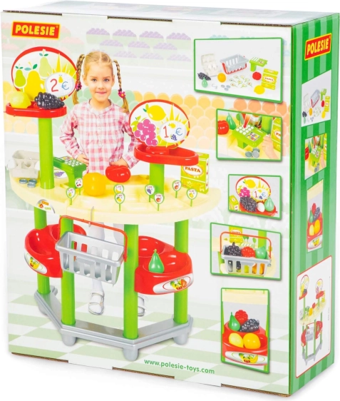 Színes és funkcionális gyerek szupermarket a Polesie márkától, amely elbűvöli a kis kereskedőket. Kínál pultot kasszával, árutartó rekeszeket és bevásárlókosarat az élethű boltos játékhoz. Támogatja a kommunikációs készségek és az alapvető matematikai képességek fejlődését az árak kiszámításakor és a visszajáró kezelésénél. Kiváló minőségű, nem mérgező műanyagból készült, biztonságos 3 éves kortól.