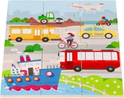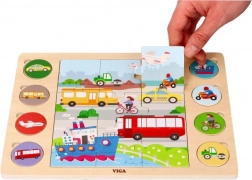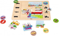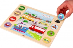 A masszív fának és a sima éleknek köszönhetően a játék 18 hónapos kortól biztonságos. A vidám színek és a letisztult formák felkeltik az érdeklődést, és segítenek jobban megismerni az autókat, buszokat, hajókat, repülőket és más közlekedési eszközöket. Befejezés után a gyermek megnevezheti a járműveket, és megkeresheti őket a nagy képen – remek tevékenység a beszédfejlődéshez.