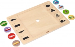 A VIGA „Találd meg és párosíts – közlekedési eszközök” fa kirakó a játék örömét okos tanulással ötvözi. Középen 9 nagy elemből álló képet raktok ki, majd a gyermek 8 kerek zsetont a táblán lévő sziluettekhez illeszt. Támogatja a természetes, játékalapú tanulást, és minden helyes párosításnál erősíti a gyermek önbizalmát.