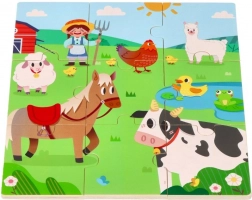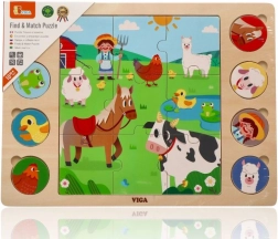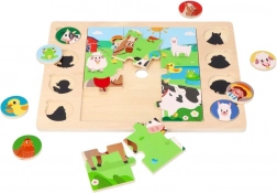 Ez az okos kirakó két tevékenységet egyesít: először a gyerekek kirakják a középső képet 9 nagy darabból, majd a 8 kerek állatos zsetont a táblán látható megfelelő árnyékokhoz párosítják. A játék természetesen bővíti a szókincset is – a kirakás után a gyerekek megnevezhetik az állatokat és megkereshetik őket a nagy farmképen.