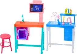 A klinika mosdókagylót, hokedlit és számítógépet tartalmaz a valósághű játékoz állatok vizsgálatára és kezelésére.