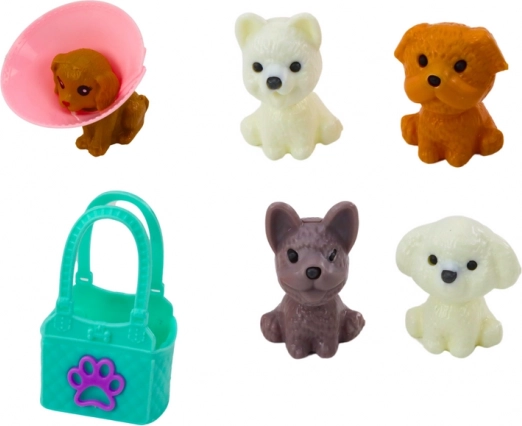 Különböző színű kölyökkutyák és egy színes mancsmintás táska, amely ideális a szállításra és kreatív játékra.