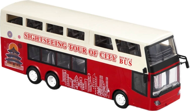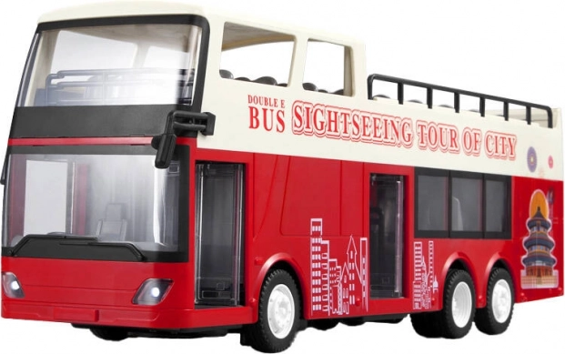 A busz ki van dolgozva élénk piros és fehér színekkel, lenyűgöző részletekkel, mint például a nyitott tető és városi látványosságokat ábrázoló illusztrációk.
