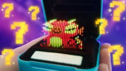 Kék doboz pixeles/animált karaktermegjelenítéssel