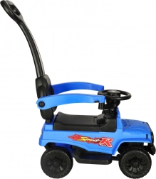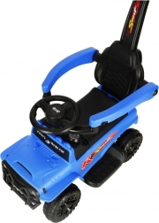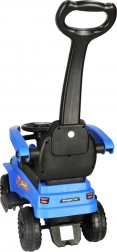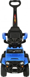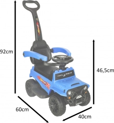 A kék, terepjáró stílusú gyerek futóbicikli-autó a szórakozást és a biztonságot ötvözi. A vezetőrúd, a védőkorlátok és a háttámla ideálissá teszik közös sétákhoz, míg a fény- és hanghatások serkentik a fantáziát és fokozzák a vezetés élményét.