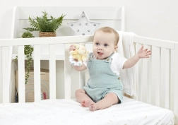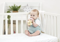 A puha plüss, a természetes színvilág és a kompakt méret ideális első játékká teszik a csörgőt.