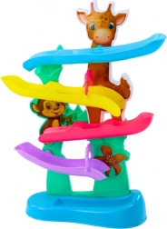Ez az interaktív, pasztellszínű golyópálya örömteli megfigyelési élményt nyújt a guruló golyók követésével, és közben támogatja a gyermekek természetes kíváncsiságát. Amint a golyó az alapba ér, zene és vadállatok hangjai szólalnak meg, gazdagítva az érzékelést és ösztönözve a további játékra.