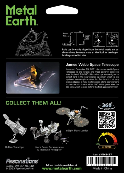 Készlet egy lenyűgöző fém 3D modell megalkotásához. A METAL EARTH kirakó építése türelmet és ügyes kezeket igényel. A befektetett erőfeszítés azonban teljes mértékben megtérül. A miniatűr replikák hatásos és figyelemfelkeltő dekorációk. Négyzet alakú acéllemezekből a kezei alatt részletgazdag, lenyűgöző modellek születnek. A METAL EARTH 3D puzzle autentikus megjelenését a részletes lézergravírozás biztosítja. Szerszámok nem részei a csomagnak. MUNKAFOLYAMAT: Az egyes darabokat távolítsa el a fémlemezekből, szükség esetén használjon kis oldalcsípő fogót (nem tartozék). Az elemeket egymáshoz zárakkal kell rögzíteni, amelyek egy beakasztóból (kampó) és egy nyílásból állnak. A kampót kis, vékony csipesszel/fogóval (nem tartozék) hajlítsa meg, és fokozatosan illessze össze az összes zárat, míg végül egy rendkívül élethű mestermű készül! Mérete a kész modellnek kb. 10,5 x 7 x 7