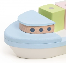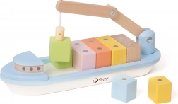 Ez a fa teherszállító hajó átgondolt játék 2 éves kortól. A csomag 12 mágneses blokkot és egy stabil hajót tartalmaz mozgatható daruval, amely megkönnyíti a „konténerek” áthelyezését. A sima formák és a minőségi fa kellemes tapintást és biztonságos játékélményt nyújtanak.
