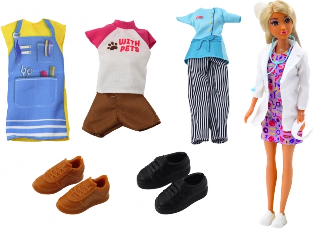 A csomagban többféle öltözék és cipő található, köztük kötény és szabadidős ruha – gyors átváltozás fodrásszá, szakáccsá vagy kisállat-gondozóvá.