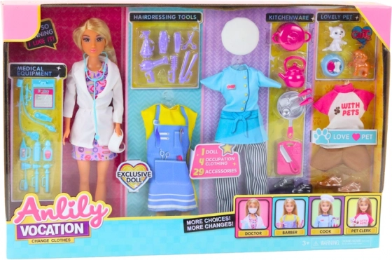 Az ANLILY baba hosszú, szőke hajjal érkezik, többféle ruhaszettel és tematikus kiegészítőkkel, hogy egy pillanat alatt orvossá, fodrásszá, szakáccsá vagy kisállat-gondozóvá változhasson. Minden szerep más-más játékszcenáriót kínál, és támogatja a szociális készségek és a kreativitás fejlődését.