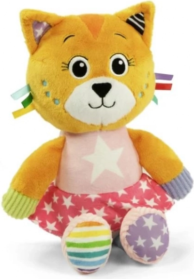 A plüss cica kiemelkedik színes megjelenésével és változatos textúráival, melyek stimulálják a gyermekek érzékszervi észlelését.