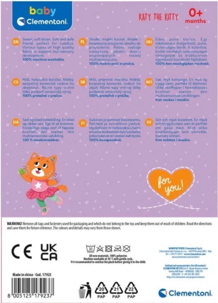 A plüss cica Katka a szülőkkel való együttműködésre lett tervezve a gyermek érzékszervi észlelésének stimulálása érdekében. Ez a játék: