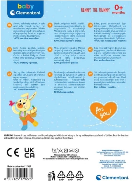 Puha nyusziplüss, a legkisebbekre gondolva készült, hogy bátorítsa őket a játékra egy puhasággal teli világban! A maszkot különböző anyagokból készült, amelyek támogatják a multiszenzoros fejlődést és segítik a tapintási érzékelés fejlődését az élet legkorábbi szakaszaiban. Ideális társ a fejlődő kisbabának. A puha plüss egy kis rágókával érkezik, amelyet kifejezetten a legkisebb játékhasználók fogzásához készítettek.