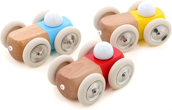 A kisautó lakkozott fából készült, ami környezetbarátabb megoldás a műanyag játékokhoz képest.
