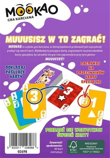 Szórakoztató és dinamikus MooKao kártyajáték a Trefltől, amelyben a cél minél gyorsabban ledobni az összes lapot a kézből. Játssz megfelelő lapokat, használd a különleges effektusokat az ellenfelekkel szemben, és ne felejts el jó nagyot múúúzni – a nevetés és az izgalom garantált!