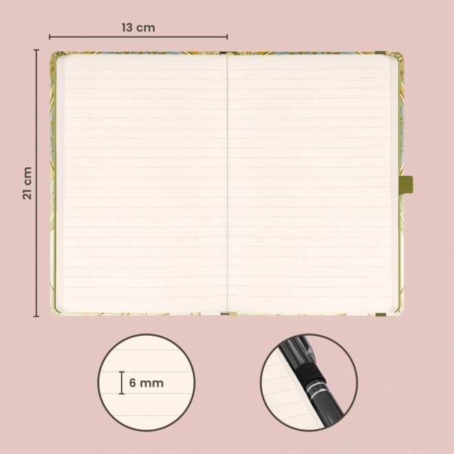 A belső zseb apróságok, névjegykártyák vagy matricák tárolására alkalmas. A sárga, pontozott struktúrájú papír sokoldalú felhasználást kínál – jegyzeteléstől a skiccelésen át a bullet journalig. A vonalazás áttekinthetőséget és kényelmes írást biztosít otthon, irodában és útközben.