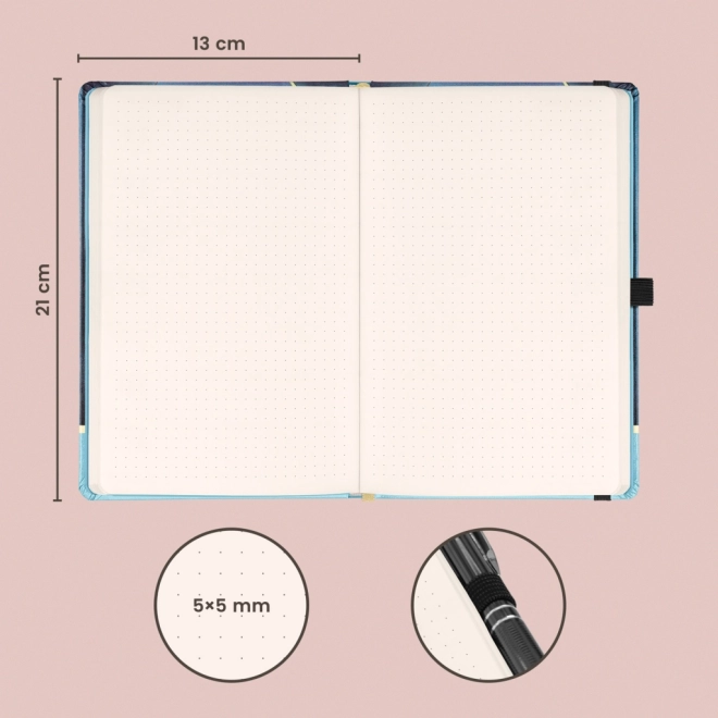 Stílusos jegyzetfüzet szecessziós művészet által inspirálva, amely klasszikus hangulatot visz a mindennapi szervezésbe. A pontozott oldalak rugalmasságot adnak íráshoz, rajzoláshoz és áttekinthető rendszerek kialakításához. A praktikus részletek – mint a gumi, a zseb és a tollhurok – kényelmet biztosítanak otthon és útközben egyaránt.