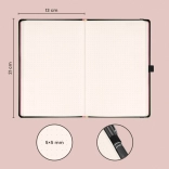 A pöttyözött oldalak szabadságot adnak a precíz tervezéshez, rajzoláshoz és áttekinthető jegyzetek készítéséhez. A gumis zárás mindent egyben tart, a hátsó zseb elrejti az apróságokat, a hurok pedig gondoskodik róla, hogy a toll mindig kéznél legyen.