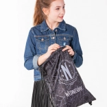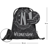 Stílusos hátizsák jellegű zsák WEDNESDAY Nevermore motívummal, ideális cipőnek, sportfelszerelésnek és apróságoknak. Erős, mosható anyagból készült, és a strapabíró zsinóroknak köszönhetően könnyen összehúzható és kényelmesen hordható a háton.