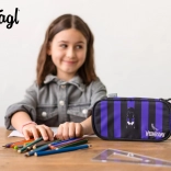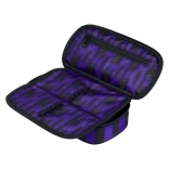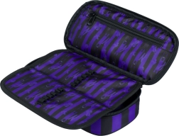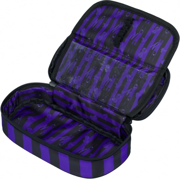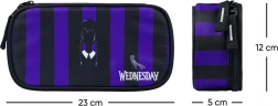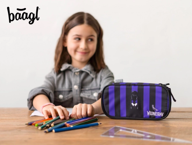 Stílusos BAAGL iskolai tolltartó WEDNESDAY motívummal, fekete–lila csíkos dizájnnal, masszív kialakítással, áttekinthető belső elrendezéssel kihajtható elválasztóval és praktikus cipzáras zsebbel. Ideális az iskolába és utazáshoz, töltet nélkül – készen áll a személyre szabásra az igényeid szerint.