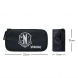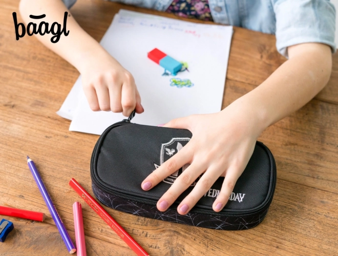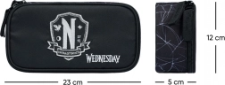 Stílusos iskolai tolltartó WEDNESDAY NEVERMORE motívummal a BAAGL-tól, masszív kivitelben, felhajtható belső elválasztóval az áttekinthető tároláshoz, valamint cipzáras zsebbel és órarendzsebbel. Ideális választás diákoknak, akik praktikus és tartós tolltartót szeretnének töltet nélkül.