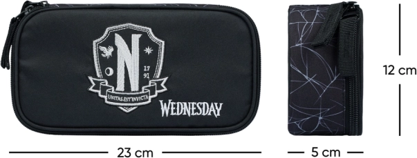 A fekete tolltartó Wednesday emblémával és felirattal eredeti megjelenésével és igényes részleteivel hívja fel magára a figyelmet, kiemelve stílusodat az iskolában és útközben is.