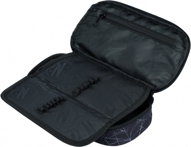 Az átgondolt belső kialakításnak köszönhetően a ceruzák, tollak, radír és apró kiegészítők mindig áttekinthetően rendezve lesznek. A stílusos részletek és a sötét fekete kivitel a Nevermore motívummal remekül kiegészíti az iskolai felszerelést.