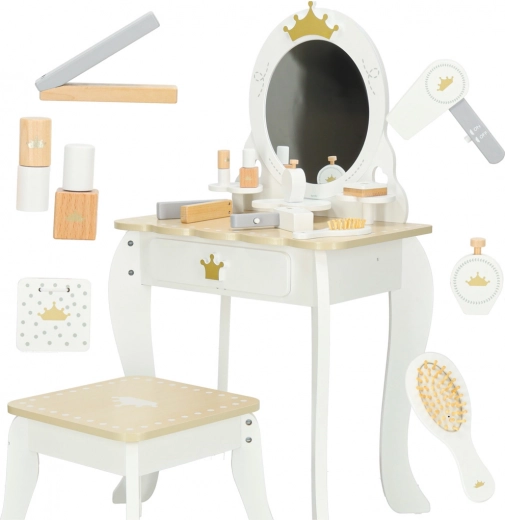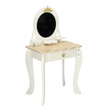 A sminkasztal a kiegészítőkkel együtt teljes egészében fából készült, amely simára csiszolt és nem mérgező festékekkel festett. A fehér-arany színvilág minimalista, és gyönyörűen díszíti a gyermek szobáját.