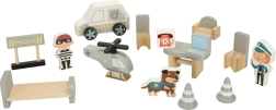 A csomag tartalmaz rendőrautót, helikoptert, kutyát, rendőrt és tolvajt, forgalmi bójákat és bútorokat a részletgazdag történetekhez.