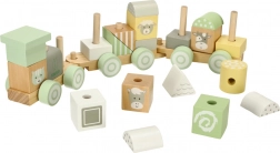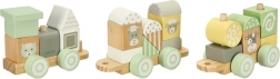 A szett 22 fa elemet tartalmaz, köztük 3 alvázat, amelyeket a gyerekek tetszés szerint kombinálhatnak és egyedi szerelvényekké állíthatnak össze.