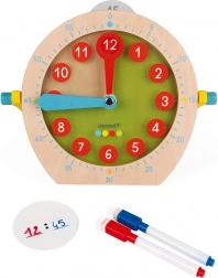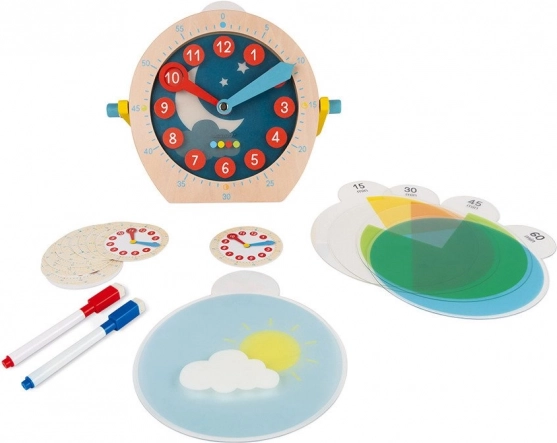 A csomag része egy 14 db letörölhető kártyából és 2 színes filcből álló készlet, mellyel a gyerekek feljegyezhetnek és ismételten gyakorolhatnak különböző időhelyzeteket – a reggeli ébredéstől az esti lefekvésig. A tartós, fából készült kivitel hosszú élettartamot és biztonságos használatot biztosít.
