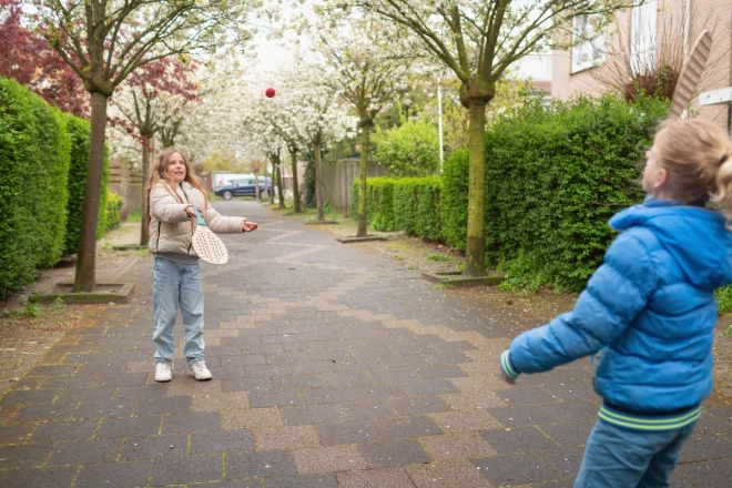 Szórakoztató kültéri játékszett, amely két minőségi fa ütőt és egy gumilabdát tartalmaz az aktív, szabadban töltött időhöz. Ideális családoknak és 6 éves kortól gyerekeknek. Támogatja a nagymozgásokat, a kéz–szem koordinációt és a állóképességet képernyők és technológia nélkül.