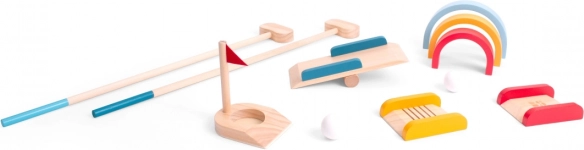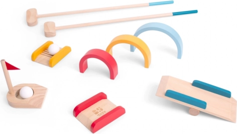 Fedezd fel a minigolf varázsát gyerek méretben! Ez a minőségi fa készlet könnyen érthető játékot kínál 1–4 játékosnak, 4 éves kortól. Az egyszerű összeállításnak és a színes akadályoknak köszönhetően a gyerekek aktív szórakozást élvezhetnek kint és bent egyaránt, miközben természetes módon fejlődik a finommotorika és a megfigyelőkészség.