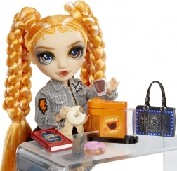 A RAINBOW HIGH Sparkle & Shine Clementine baba feltűnő narancssárga megjelenéssel, farmerdzsekivel, kockás szoknyával és RAINBOW feliratú platformcipőkkel érkezik. Tartozék az állvány, a fésű és a kávé témájú kiegészítők, amelyek bővítik a játéklehetőségeket és a történeteket.