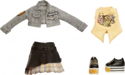 A feltűnő narancssárga, fonott haj, a felvarrókkal díszített farmerdzseki és a RAINBOW feliratú platformcipők Clementine-t bármelyik kollekció sztárjává teszik.
