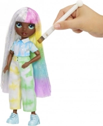 Fedezd fel a színek világát a RAINBOW HIGH Watercolor & Create kreatív babával. Szórj port a vízbe, mártsd bele a hajat vagy az outfitet, és a szivaccsal alkoss egyedi mintákat. A gumigyűrűkkel batikolhatsz és egyedi streetwear megjelenést hozhatsz létre. A színek kimoshatók, így újra és újra megváltoztathatod a stílust.